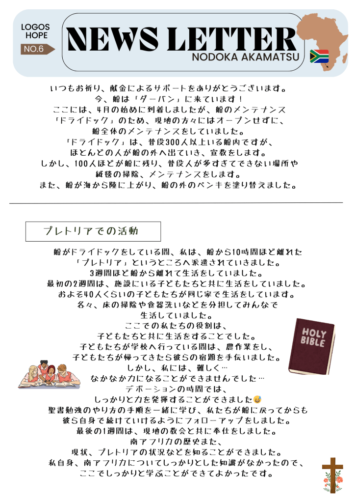 2024年5月22日2024年5月22日 nodoka20 ニュースレター第6号 みなさん、ニュースレター第6号を作成しました。ドライドック中に派遣された先の宣教活動について書きました。ぜひ、読んでください。また、周りの方々にもシェアしてくださると幸いです。 共有: クリックして X で共有 (新しいウィンドウで開きます) X Facebook で共有するにはクリックしてください (新しいウィンドウで開きます) Facebook いいね 読み込み中… 関連